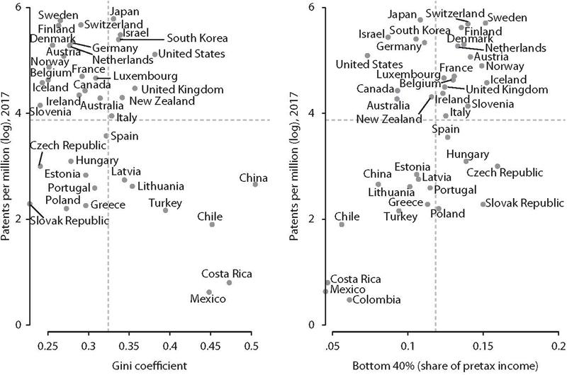 I consider these complications in more detail in chapters 2 and 3. The clearest test of the innovation–equality tradeoff is given in figure 2, which presents two simple scatter plots of several countries, with different measures of inequality on the horizontal axis, and patenting per capita on the vertical axes. The plots effectively divide the nations into four clubs. In the left-hand plot, at the top left are