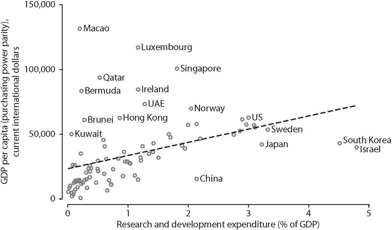 A third route to prosperity is innovation, or the development and application of new products and processes. Because natural resources are finite and tax havens are small, most rich countries have innovation at the heart of their economic model. If you plot their gross domestic product (GDP) per capita, a measure of national income, against research and development (R&D) intensity,