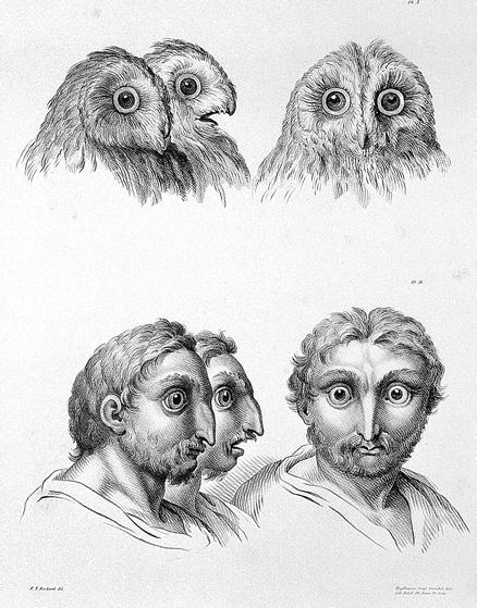 Charles Le Brun, comparison of human physiognomy with that of owls, illustration from a lecture delivered to the Royal Academy of Painting and Sculpture, Paris, 1671. Wellcome Collection.