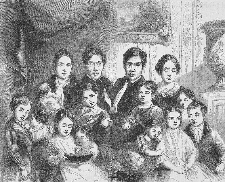 A characteristic depiction of Chang and Eng, the “Siamese twins,” with their wives and children, artist unknown, circa 1850–75. Cushing/Whitney Medical Library Prints and Drawings Collection, Yale University.