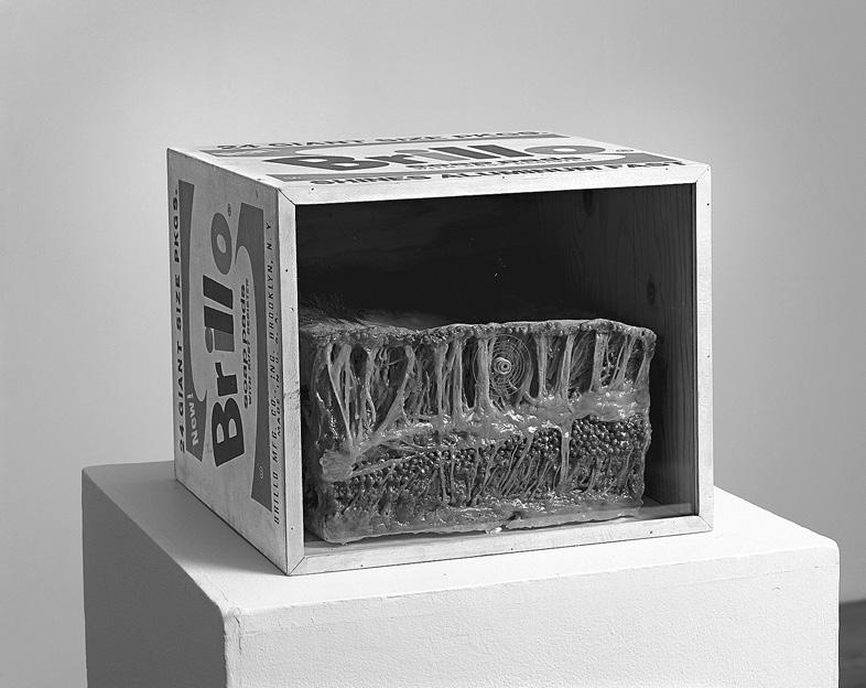 Paul Thek, Meat Piece with Warhol Brillo Box, from the series Technological Reliquaries, 1965. Wax, painted wood, and Plexiglas, 14 × 7 × 17 inches (35.6 × 43.2 × 43.2 cm). Philadelphia Museum of Art, purchased with funds contributed by the Daniel W. Diedrich Foundation, 1990. Copyright Estate of George Paul Thek. Photograph: D. James Dee. Courtesy Alexander and Bonin, New York.