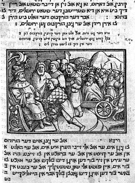The same image used in a Yiddish translation of Sefer Yosippon printed in 1546 to depict Herod greeting the former high priest Hyrcanus. (National Library of Israel, 8-91 A 549, p. 492 [detail])