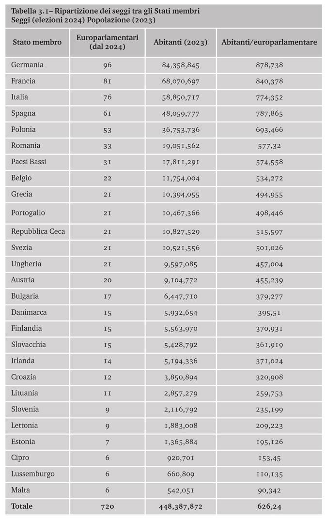 La ripartizione dei parlamentari tra gli Stati membri avviene in modo “degressivamente proporzionale” alla loro popolazione. Significa che, per consentire un minimo di rappresentatività agli Stati più piccoli, gli Stati più popolosi sono proporzionalmente meno rappresentati. In termini numerici, la rappresentanza degli Stati più piccoli (Lussemburgo, Cipro e Malta) è stato fissato in 6 deputati ciascuno, numero minimo consentito, quasi un “diritto di tribuna”. La Germania, che è lo Stato più popoloso, ne ha 96, numero massimo previsto dal Trattato. Poi vengono, dopo la redistribuzione del 2023: la Francia con 81, l’Italia con 76, e di seguito tutti gli altri (vedi tabella 3.1).