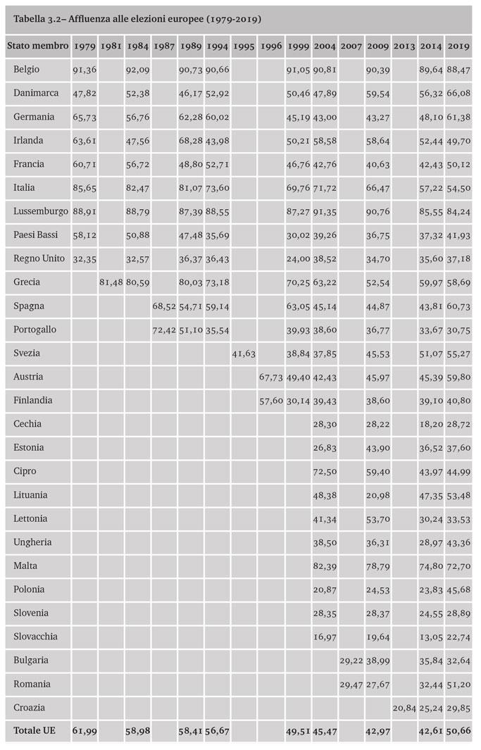 Nonostante la diversità delle leggi elettorali, non va sottovalutata inoltre la circostanza che per il Parlamento europeo si voti, in tutti gli Stati membri, contestualmente (o quasi: resistendo, come si è accennato, particolari tradizioni elettorali quanto al giorno di apertura dei seggi elettorali, in base alle quali, per esempio, nei Paesi a tradizione calvinista si vota nei giorni centrali della settimana anziché nel weekend). La diversità dei sistemi elettorali concretamente adottati da ciascuno Stato membro, e la differenza di regime giuridico sulla obbligatorietà dell’esercizio del diritto di voto, finiscono per introdurre, peraltro, qualche disparità “in uscita”: ossia, nell’equivalenza del risultato dell’esercizio di tale diritto. Il tutto si è riflesso anche nei dati sull’affluenza al voto (vedi tabella 3.2), la quale nel complesso è andata regolarmente calando in ogni elezione, dal 1979 al 2014 (dal 61,99 per cento al 42,61 per cento), ma è tornata a crescere, finalmente, nelle elezioni del 2019 (attestandosi al 50,66 per cento). Sempre peraltro con grandi disparità a seconda degli Stati membri: alle ultime elezioni del 2019, per esempio, l’affluenza variò dall’88,5% del Belgio al 22,7% della Slovacchia.