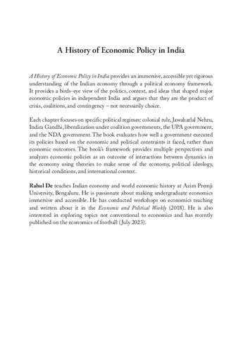 In this book, I present an accessible history of economic policies in India from colonial to contemporary India. This book is meant to serve as a representative sample of important academic literature on the Indian economy organized thematically. It aims to provide a socio-historical narrative to explain economic policies in contemporary India. This work will be of particular value to readers who do not have a background in economics and might not have the time or inclination to read multiple works to understand a particular period or policy in Indian history. It can also serve as a complementary resource to a teacher as it provides a coherent and accessible narrative connecting different periods and different data sources, public documents, and academic literature that can be brought to the classroom.