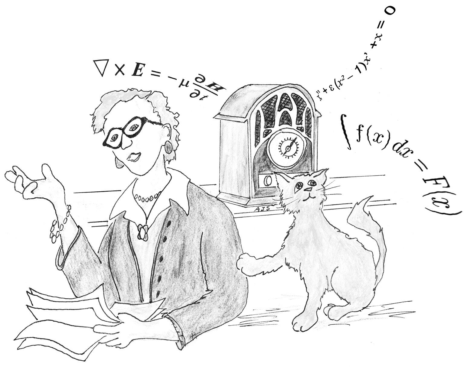 As a second analogy, consider Figure 4, my sketch of Mary Cartwright (1900–1998)—a PhD student of Hardy’s and a multiple coauthor with Littlewood—and of a cat,39 and of a radio broadcasting equations. In this analogy, I am the cat, somewhat befuddled and vaguely alarmed by equations streaming from the radio, and Paul is a Mary figure, clearly explaining the details. In particular, the differ-