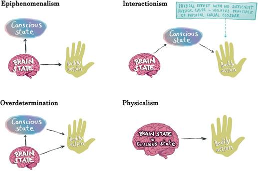 Anotherwayofunderstandingtheargumentisasclaimingthattherearefour possiblepositionsonemaytakeonmentalcausation,interactionism(which impliesviolationofphysicalcausalclosure),epiphenomenalism,overdetermination,andphysicalism,amongwhichphysicalismisthemostplausibleoption. Thepositionscanbeillustratedasin Figure3.