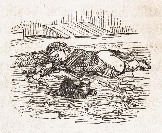 Images of children have been used both to teach about the harm of alcohol consumption and to market its pleasures. In nineteenth- century temperance texts, children are disposable, often quickly eradicated by a drunk adult or by liquor itself. In The Glass of Whisky (1860) published by the American Sunday School Union, a 6-year- old boy inadvertently drinks a jug of rum from a closet and dies in the street (see Figure 3). Temperance advocates used cautionary tales like this one to emphasize that even a sip of alcohol would lead
