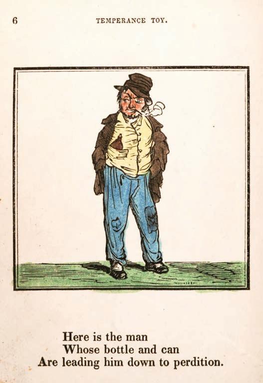 subject of temperance.º 18 On the first page of Temperance Toy an inebriated man stands red-faced, smoking, in patched pants, with a bottle in his vest pocket. The red face and bulbous nose (often a signifier, ªalcoholic's noseº or rhinophyma is due to an untreated skin condition, rosacea) code him as a drunkard. Visual markers like these reveal how ªthe interpretations people make of drinking, of the intoxicated state, and of behav ior under intoxication are only partially shaped by the chemical or pharmacological effects of alcohol.º19 The text that accompanies the image reads, ª Here is the man, whose bottle and can, are leading him down to perditionº (see Figure 9).20 The bottle ushers the man to eternal damnation, and, as the illustration testifies, to disease and poverty in the here and now.