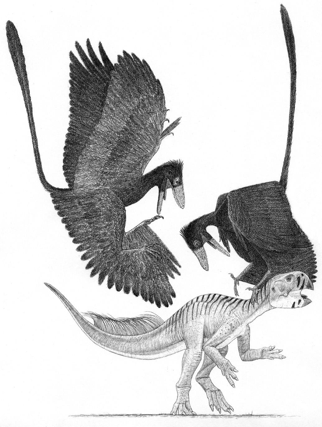 The flying dinosaur Sinornithosaurus attacking Psittacosaurus