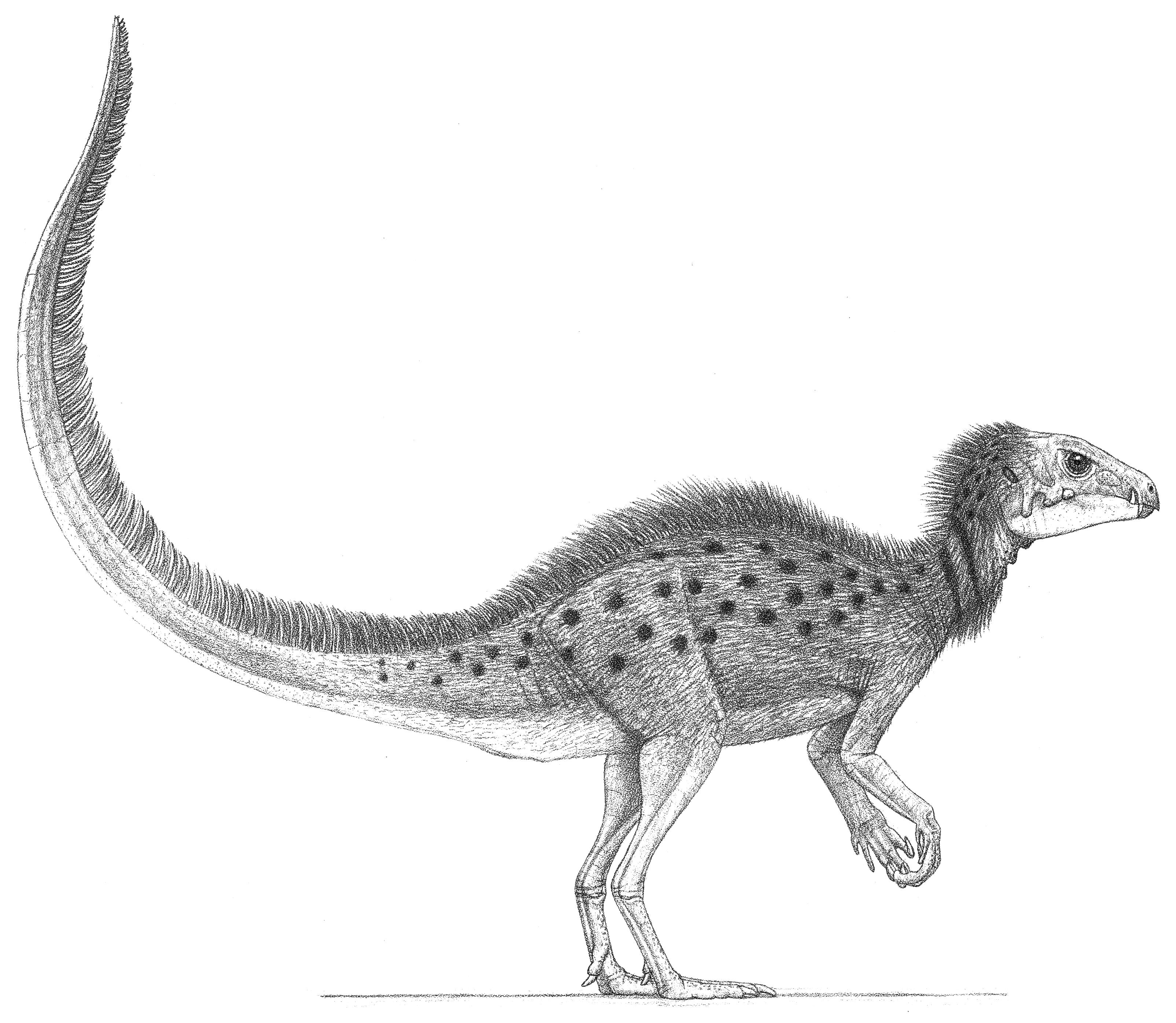 In the mid-1990s, complete fossils of small compsognathid theropods labeled Sinosauropteryx began to show up with their bodies covered with dense coats of bristly protofeathers, to the delight of Ostrom and others. More recently it has been argued that it is often possible to determine the color of the feathers! This was just the start: the Yixian-Jiufotang beds are so extensive and productive that they have become an inexhaustible source of beautifully
