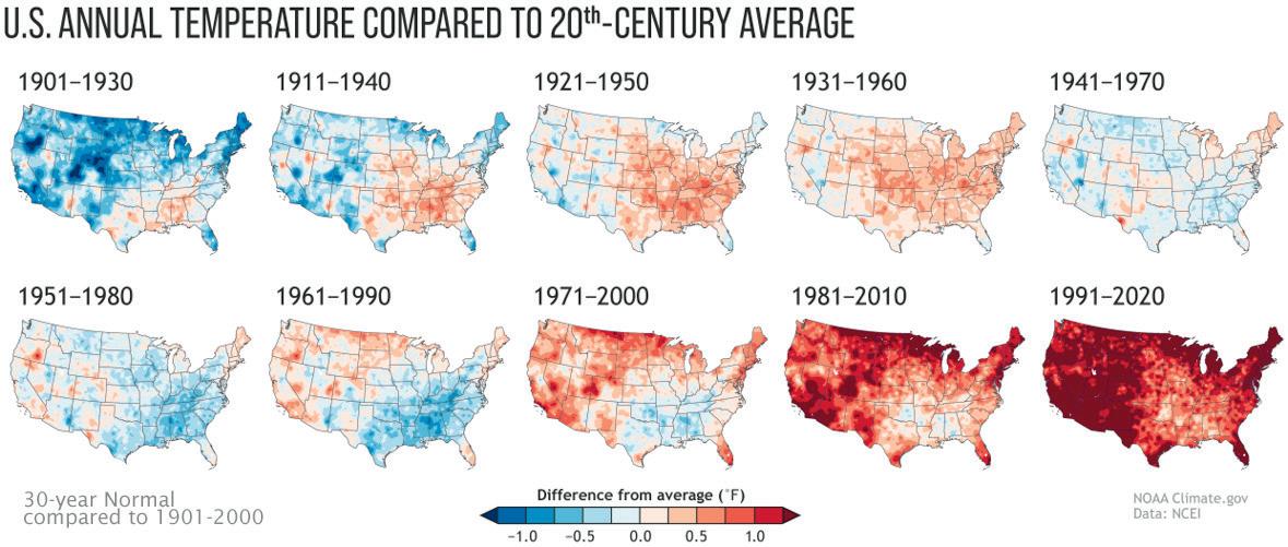 Figure 5. Temperature changes: The red tones represent regions where average annual temperatures for each three-decade period are higher than the 20th-century average. Blue indicates regions where the average annual temperatures are lower than the 20th-century average. Image from no AA .