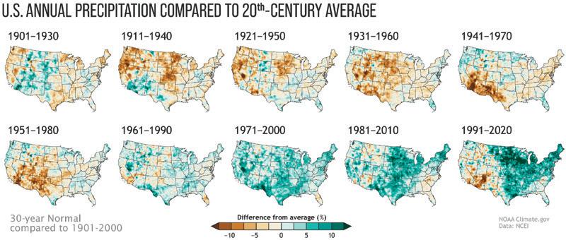 Figure 6. Precipitation changes: this figure illustrates how precipitation has increased relative to the beginning of the 20th century for three-decade periods. In the mid-20th century, rainfall was reduced, but by the end of the century and beginning of the 21st century, rainfall strongly increased. Image from no AA