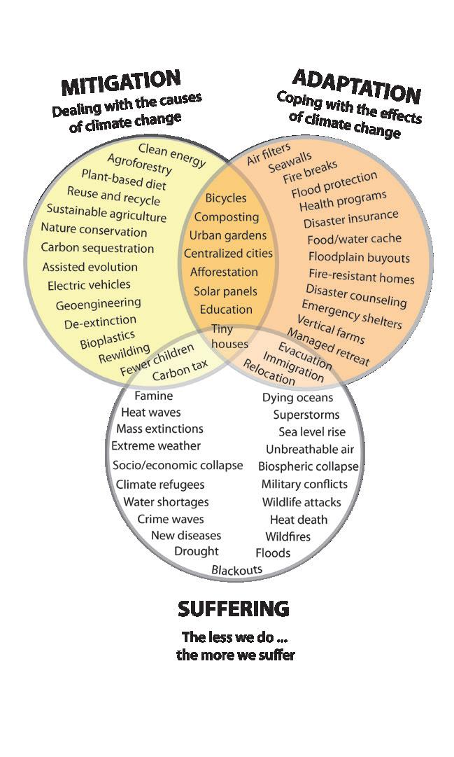 Figure 2. The diagram illustrates the overlap between climate change adaptation, mitigation, and suffering. Drawing by Charles Pilkey.
