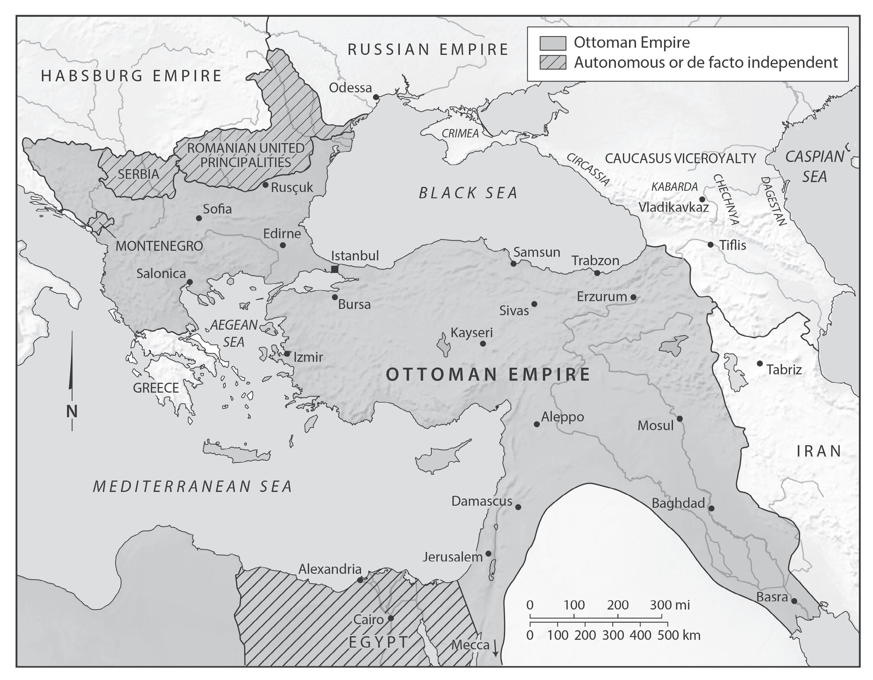 This book relies on many sources in Ottoman Turkish, Arabic, Russian, and Bulgarian. I transliterate Ottoman Turkish using Modern Turkish orthography, without diacritics. For Arabic, I adopt the transliteration system of the International Journal of Middle East Studies, marking ʿ ayn as ʿ and hamza as ʾ. For Russian and Bulgarian, I use the Library of Congress transliteration systems. Transliterations from Circassian (both Adyghe and Kabardian) are based on the romanization system adopted by the United States Board on Geographic Names and the (British) Permanent Committee on Geographical Names.