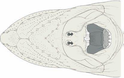 The description text includes each species’ shape and other distinctive features. The drawings on pp.30–34 identify the body parts referred to in the text. There are also sections on colour and dentition. Dentition descriptions include tooth counts (where known); this is the total number of tooth rows along both jaw lines (left and right) of the upper and lower jaws. This figure is not the total number of teeth to be found in the jaw as this would include all the series of teeth in the rows, it is only the outermost series, the functional teeth, that are the rows counted (see p.35). Throughout the book, key guides help identify teeth for a particular group or, in the case of sharks, to species level. These key guide dentition illustrations are of all the functional teeth, from one side of the upper and lower jaws; accompanying scale bars indicate the size of these adult teeth.
