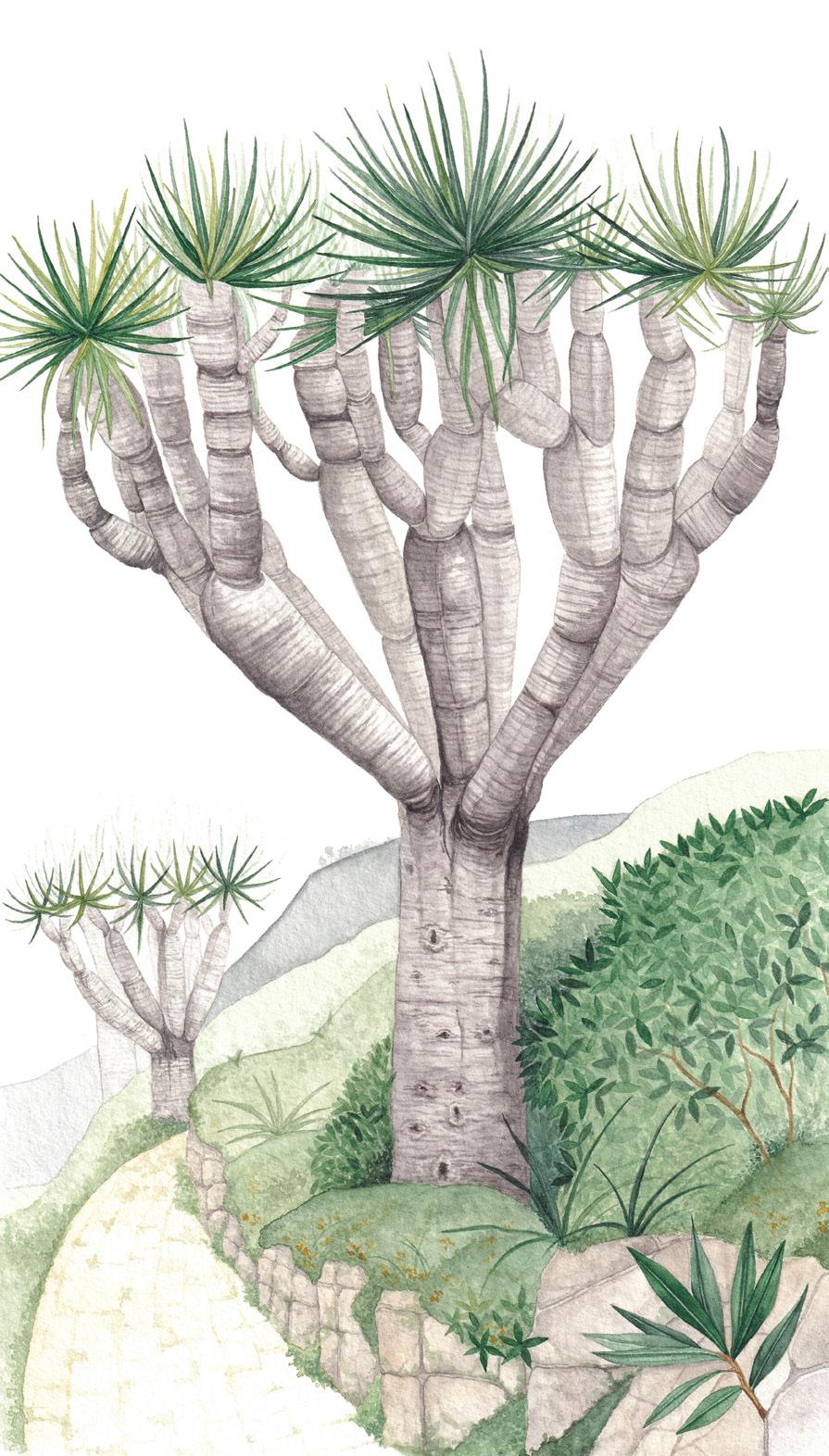  The dragon tree (Dracaena draco) is native to the Canary Islands. A member of the Asparagus family, it has secondary woody tissue and can attain heights (and widths) of 50 ft (15 m) in nearly frost-free climates.