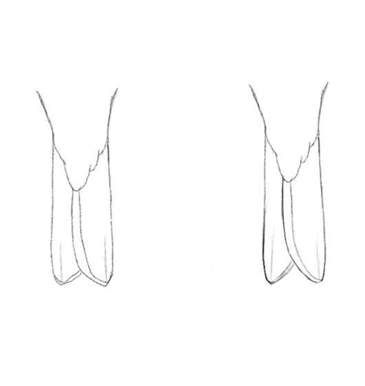 There are 12 tail feathers (rectrices), numbered r1 to r6 symmetrically from the center of the tail outward. The central tail feathers are represented by r1 to r3 and the outer-tail feathers represented by r4 to r6.