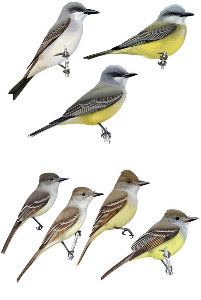 The tyrant flycatcher family Tyrannidae is one of the largest bird families in the world with 101 genera and more than 400 species. Tyrant flycatchers are only found in the Americas, with the majority occurring in Central and tropical South America. They are mostly carnivorous, but sometimes frugivorous, catching their prey (insects and small reptiles) directly from the air, gleaning it from vegetation, or pouncing on it on the ground or other substrate. Here, we focus on a subset of the family, the genera Myiarchus and Tyrannus. These two genera consist of medium to large flycatchers—distinctly larger and slightly more colorful than the Empidonax flycatchers. Worldwide, there are 22 species currently recognized in the genus Myiarchus, with six recorded in the United States. There are 13 currently recognized species in Tyrannus, with ten recorded in the United States. The number of species, however, may increase in the future if some of the tropical subspecies become elevated to species status.