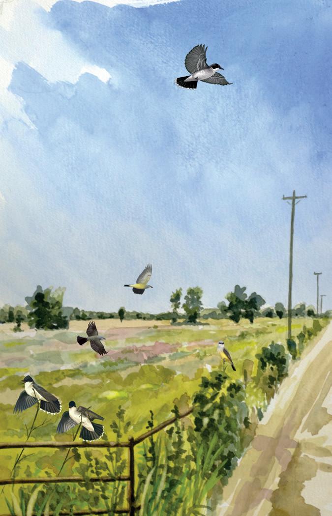of their aggressive behaviors when on territory. Fork-tailed and Scissor-tailed Flycatchers also fall into this genus: they are kingbirds with long tails. For the purposes of this guide, the kingbirds can be visually categorized into a “yellow-bellied” group and a “whitebellied” group.