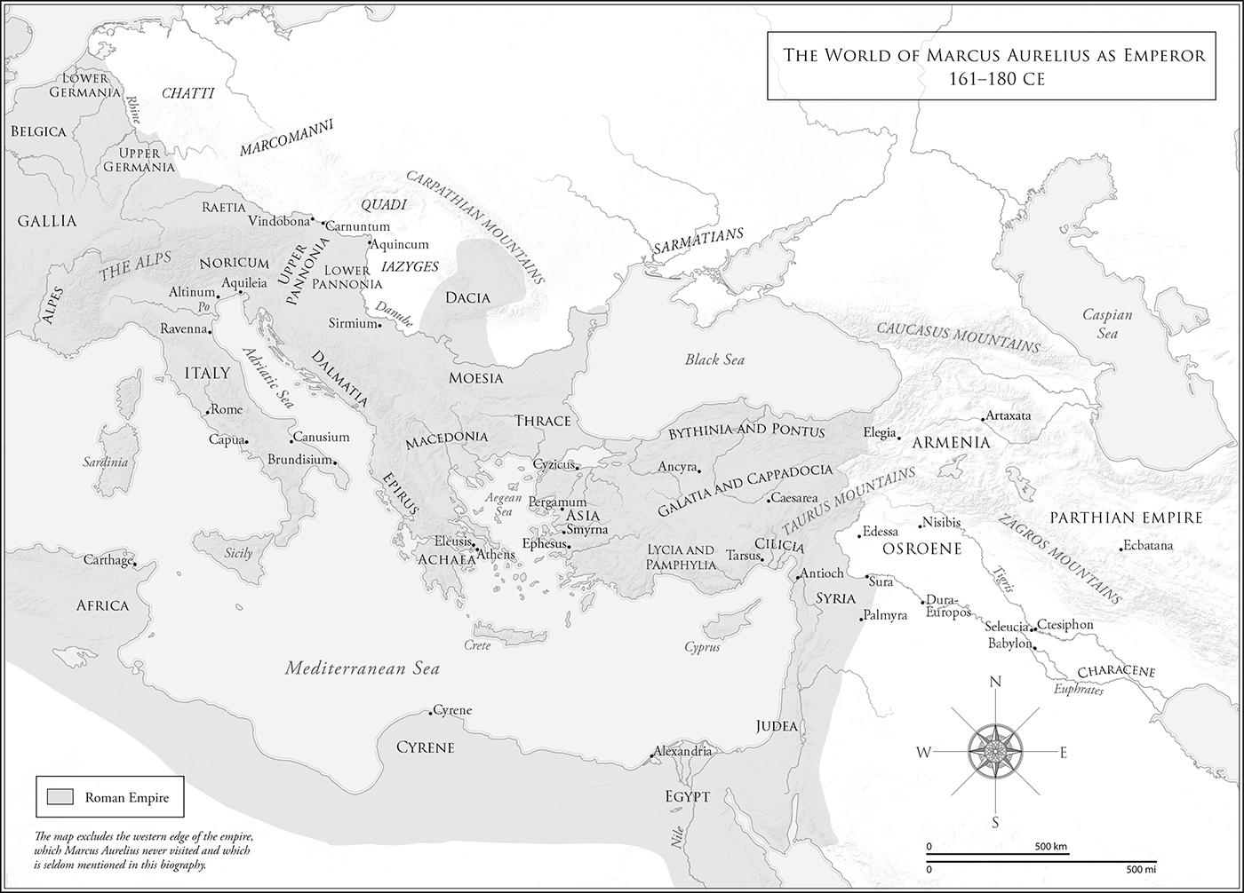In these sources, we encounter colorful characters with whose lives Marcus Aurelius’s story was intertwined. The emperor Hadrian, for instance, features prominently in this book because he had a profound influence on the boy’s upbringing. Marcus Aurelius was born under Hadrian’s rule, later adopted as his grandson, and even brought to live in his villa during the final months of Hadrian’s life. Hadrian has a reputation today as one of the better emperors, which he owes in part to Marguerite Yourcenar’s celebrated novel Memoirs ofHadrian:as one of his other biographers notes, “It is no exaggeration to say that for a while Mme. Yourcenar supplanted the academics. Her Hadrian was received as a true image of the real thing.”16 Yourcenar’s book, considered by many to be a literary masterpiece, draws on careful research. It was, however, intended as a work of historical fiction, and it portrays Hadrian far more sympathetically than is justified by the historical evidence. It is written from Hadrian’s perspective in the form of letters from him to the young Marcus Aurelius, whose replies we never see. The book you are currently reading is more concerned with that boy’s story— and Marcus Aurelius had nothing positive to say about Hadrian.