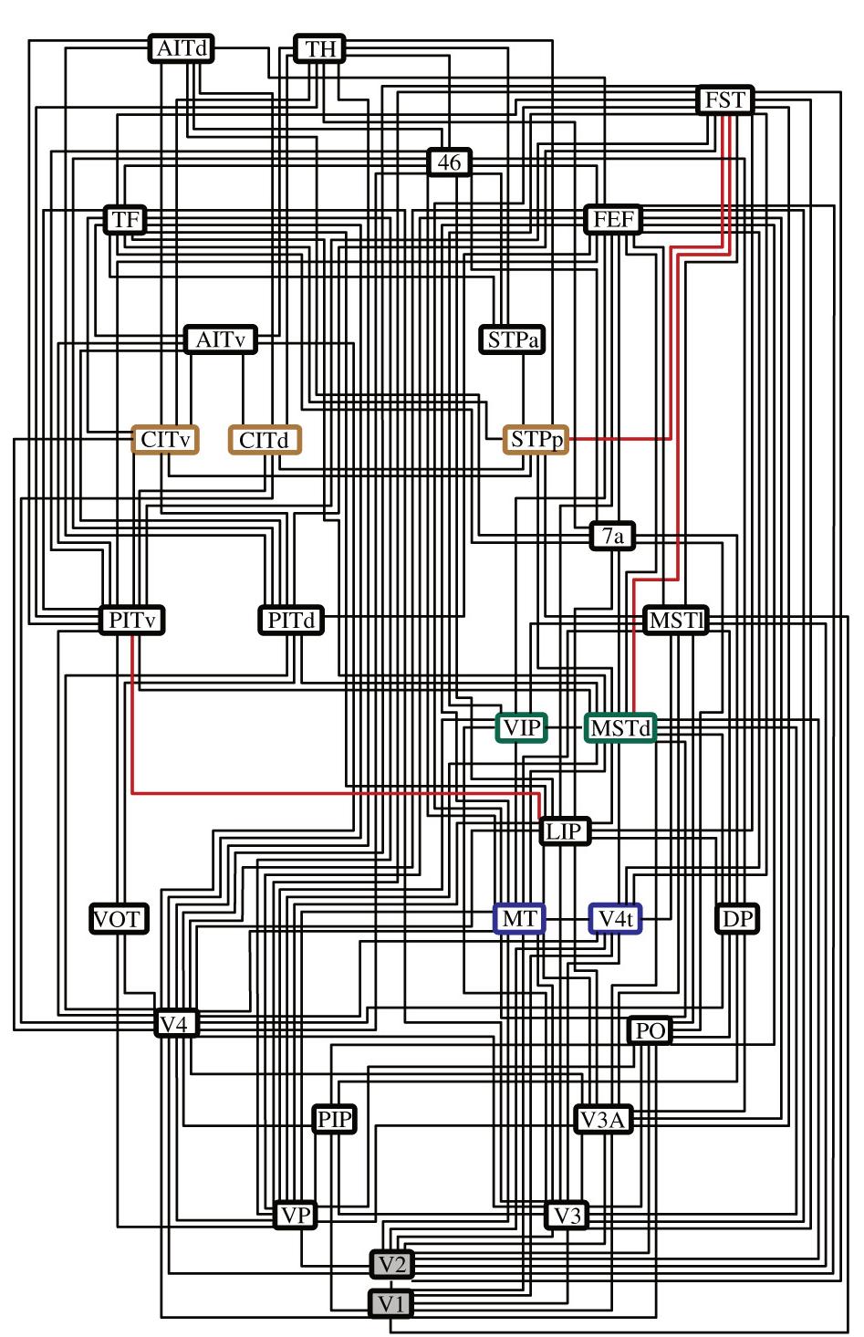 Fig.1.3 Exampleofamapofconnectivitybetweencorticalareasinvolvedinvisualprocessing [reprintedwithpermissionfromC.Hilgetag,M.O’Neill,andM.Young, PhilosophicalTransactionsoftheRoyalSocietyofLondonB 355:71–89(2000)].