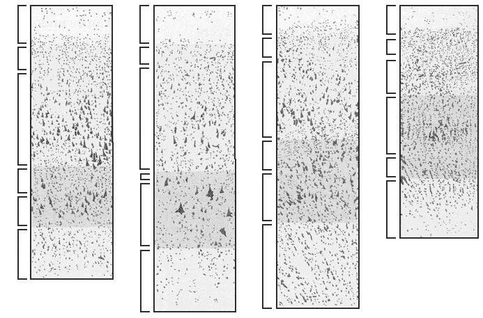 Historically,theneocortexisdividedintosixlayerslabelledwithRomannumerals fromItoVI,althoughmorethansixlayers,commonly10includingthewhitematter, canbeidentifiedandareincludedintothehistoricallabellingschemebyfurther subdivisions.LayerIVistherebysubdividedintoIVA,IVB,andIVC,andlayerIVC isfurthersubdividedintolayersIVCα andIVCβ.Theextent,orthickness,ofthe layersvariesthroughouttheneocortexuptoapointwheresomelayersaredifficult toidentifyifnotabsent.Examplesofstainedslicesfromdifferentareaswithinthe