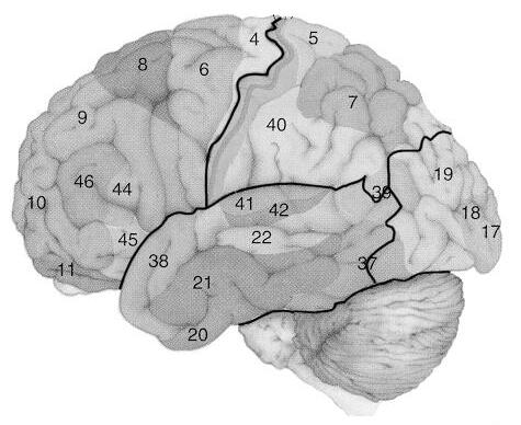 Fig.1.2 Outlineofthelateralviewofthehumanbrainincludingtheneocortex,cerebellum,and brainstem.Theneocortexisdividedintofourlobes.ThenumberscorrespondtoBrodmann’s classificationofcorticalareas.Directionsarecommonlystatedasindicatedin1.2B.