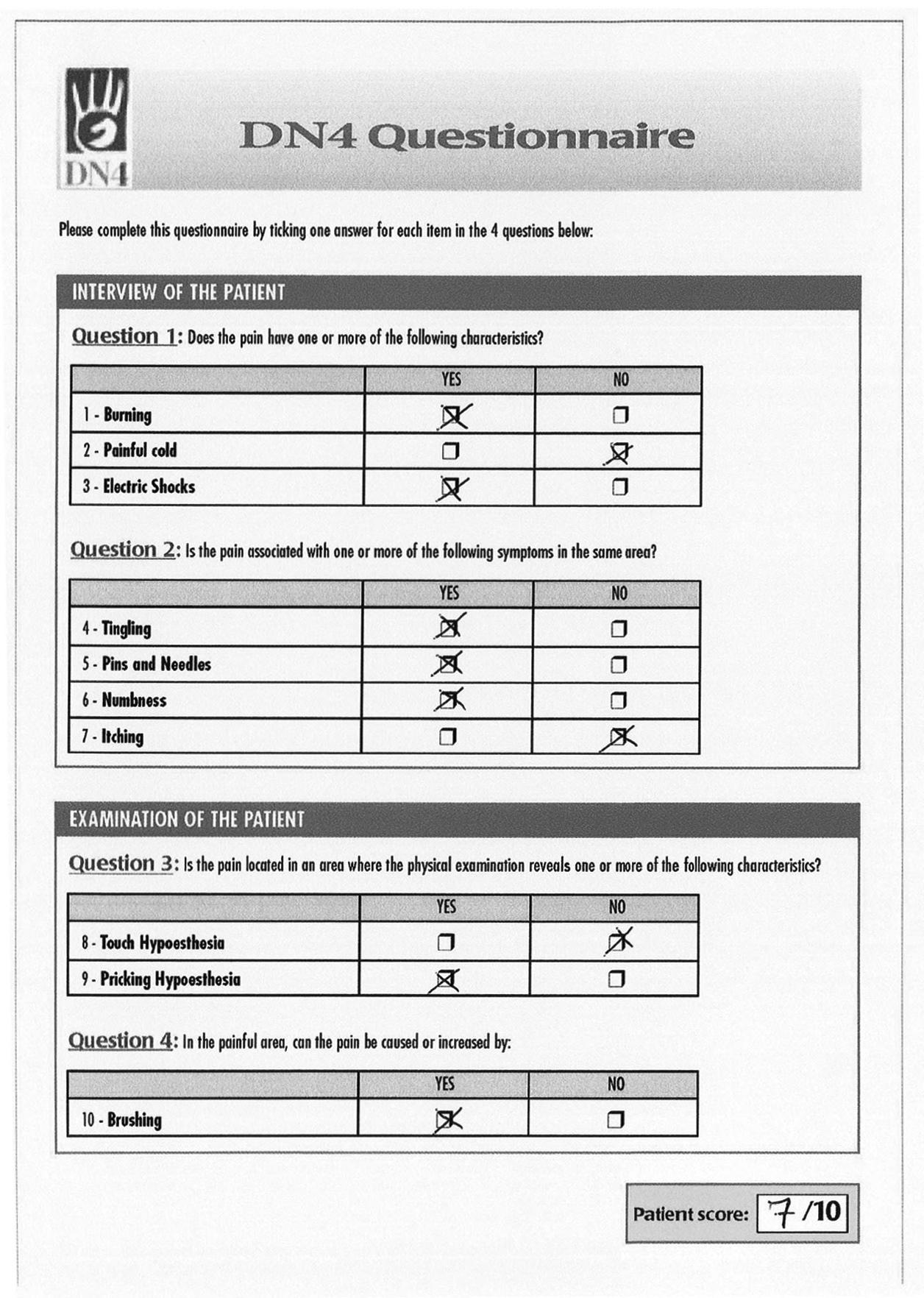 FIG u RE 1.2 Score obtained by the patient on the DN4 questionnaire. The score is 7 out of 10, which orients toward neuropathic pain (cutoff value for the detection of neuropathic pain is ≥ 4/10). The cutoff value for detection of neuropathic pain based on the DN4 interview (seven first items of the DN4 questionnaire) is ≥ 3/7.