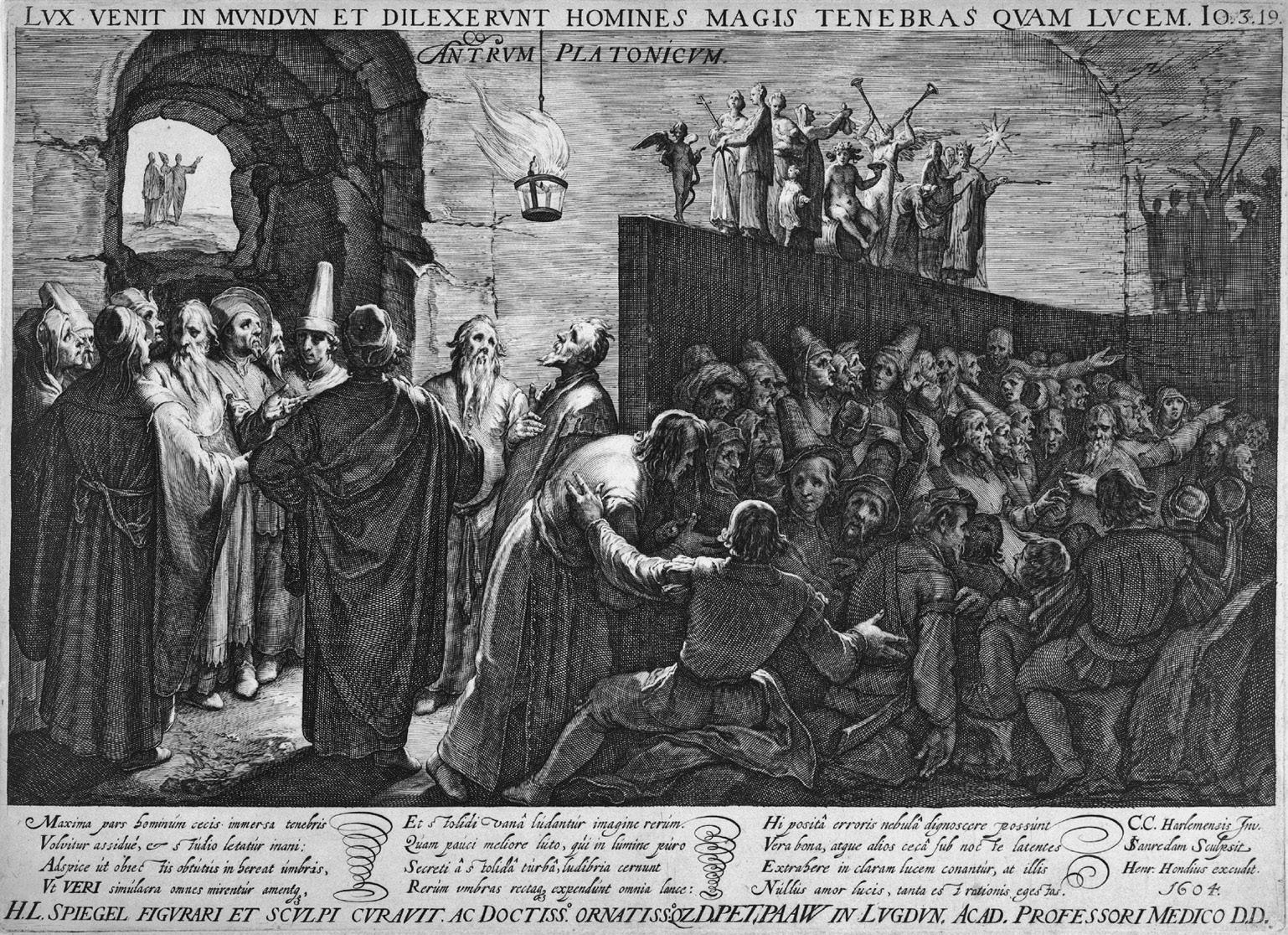 by the poet, Hendrik Laurenszoon Spiegel, who probably also gave detailed instructions about its composition and who is thus responsible for some of its deviations from Plato’s description of the Cave (McGrath, pp. 228–232). The engraving illustrates a later passage from Plato’s Allegory than that shown in the diagram. In it, Plato describes how, after having escaped his imprisonment in the Cave and having seen the world of real things illuminated by sunlight, one of the prisoners returns to the Cave to enlighten his fellow prisoners about the nature of reality. A tumult ensues among the prisoners who debate the veracity of their fellow’s testimony. Most of the Cave dwellers are skeptical of his report and, as the supertitle
