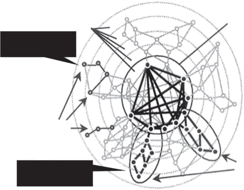 Te “global workspace” model of consciousness (Dehaene, 2014) is illustrated in Figure 1.2. Te outer ring indicates the sensory surfaces of the body. Circles are neural systems and lines are links between them. Filled circles are activated systems and thick lines are activated links. Activated neural coalitions compete with one another to trigger recurrent (reverberatory) activity, symbolized by the
