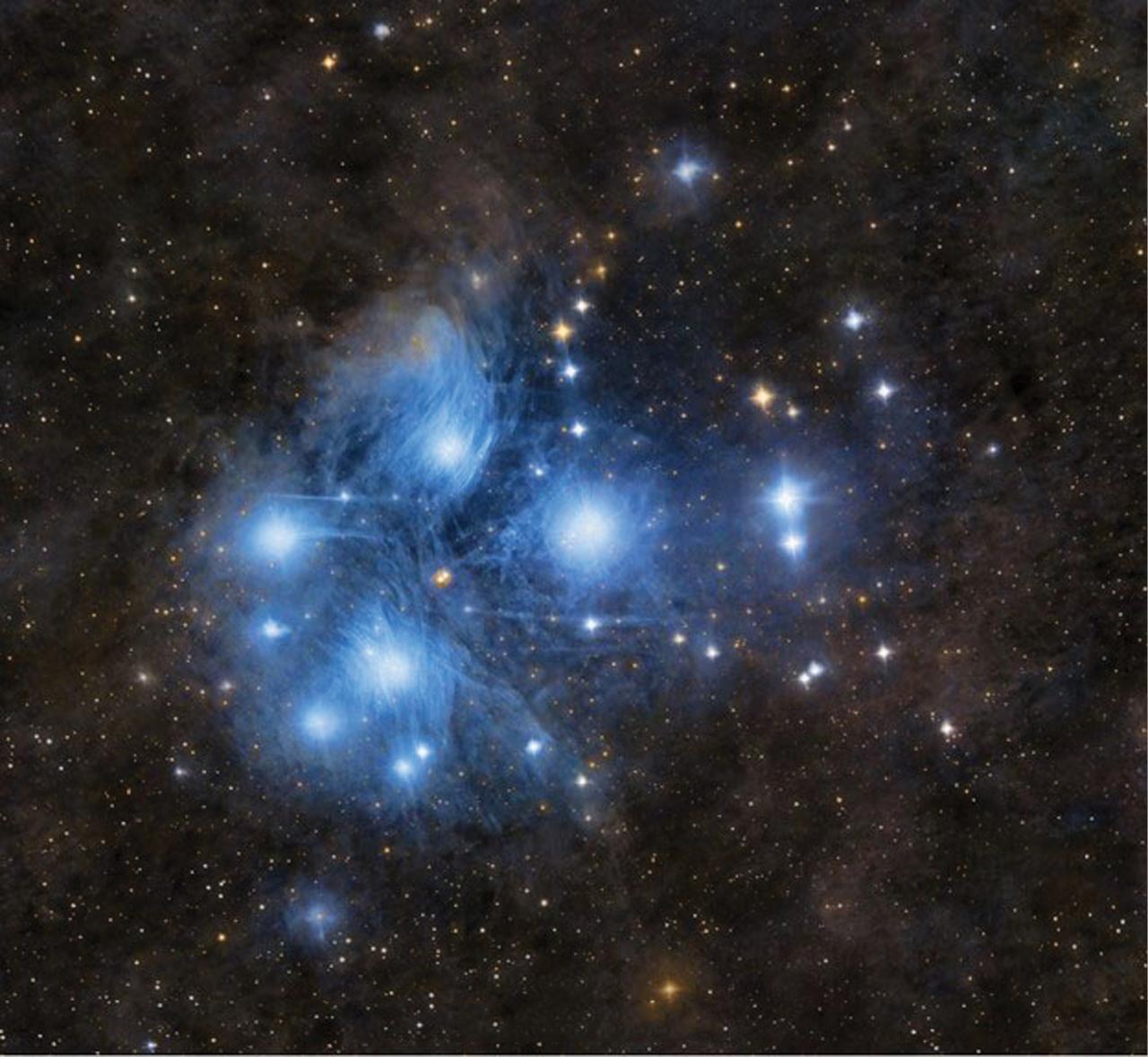Figure 1.1. The Pleiades Star Cluster (M45). Located about 444 light years away, M45 is one of the closest star clusters to Earth. Although easily visible to the naked eye, Galileo was the first to observe the cluster through a telescope and found many more stars too dim to see without visual aid. The blue color is light reflected off the surrounding dim dust from the hot blue stars of the cluster. This image is about ten hours of data captured with a Celestron RASA 8. (Image courtesy of Michael R. Shapiro)