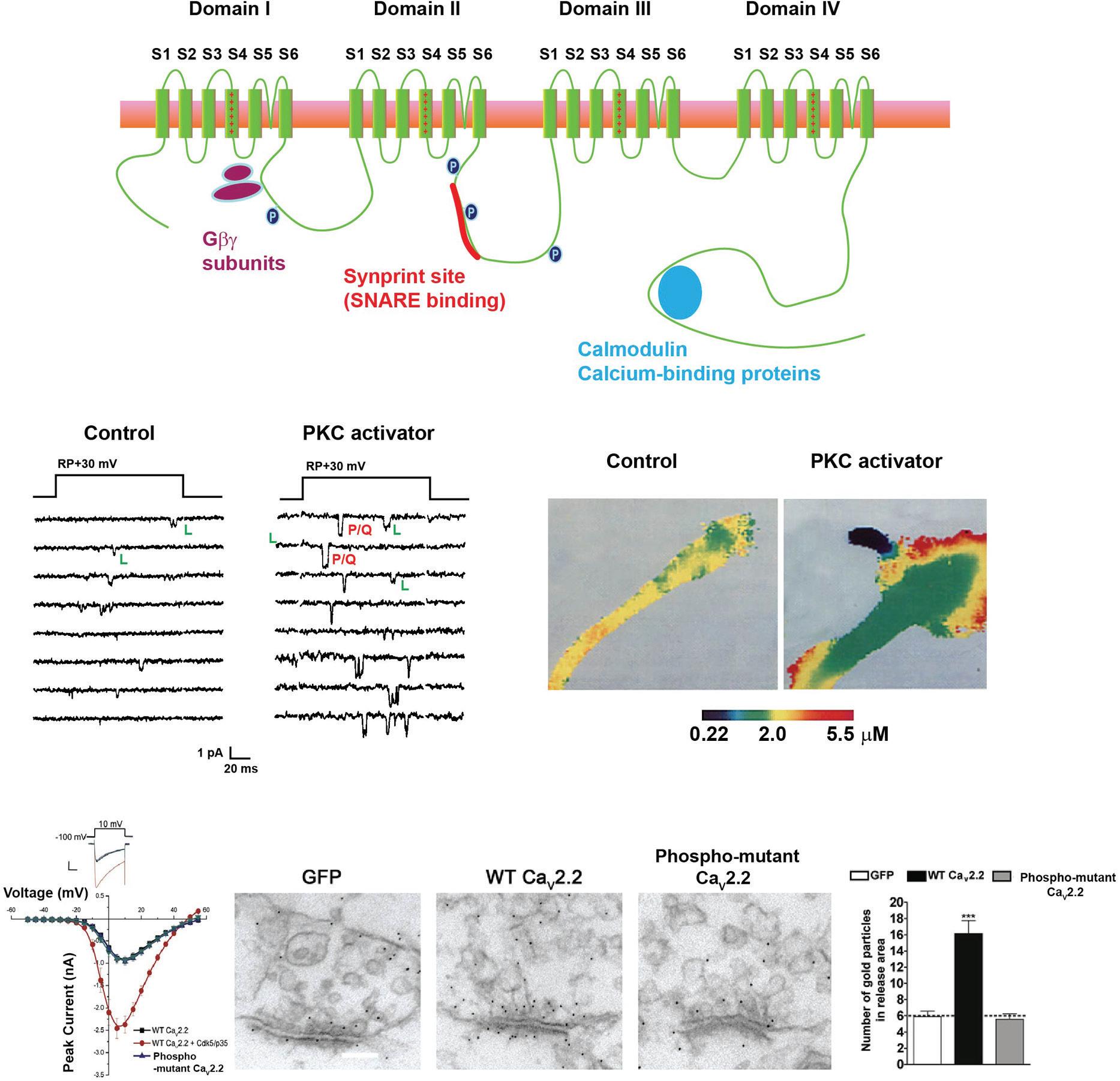 control fusion of synaptic vesicles with the plasma membrane. Thus, modulation of these channels, through mechanisms such as phosphorylation, produces strong direct effects on neurotransmitter release, as well as shaping neuronal excitability (Catterall, 2011). In some cases, activation of a kinase results in the insertion of new calcium channels into the plasma membrane from an intracellular pool. An example of this is provided in Figure 1.3A, which shows single-channel recordings of channels in neurosecretory neurons of Aplysia. Under control conditions, only a single species of L-type (CaV1.3) can be detected, but activation of protein kinase C causes the insertion of a P/Q (CaV2.1) channel that contributes to increased release of neuropeptides resulting from enhanced calcium influx during action potentials (Figure 1.3B). Another example is shown in Figure 1.3C, which shows that currents of mammalian CaV2.2 (the N-type channel) are substantially enhanced by activated cyclin-dependent kinase 5 (Cdk5) (Su et al., 2012).