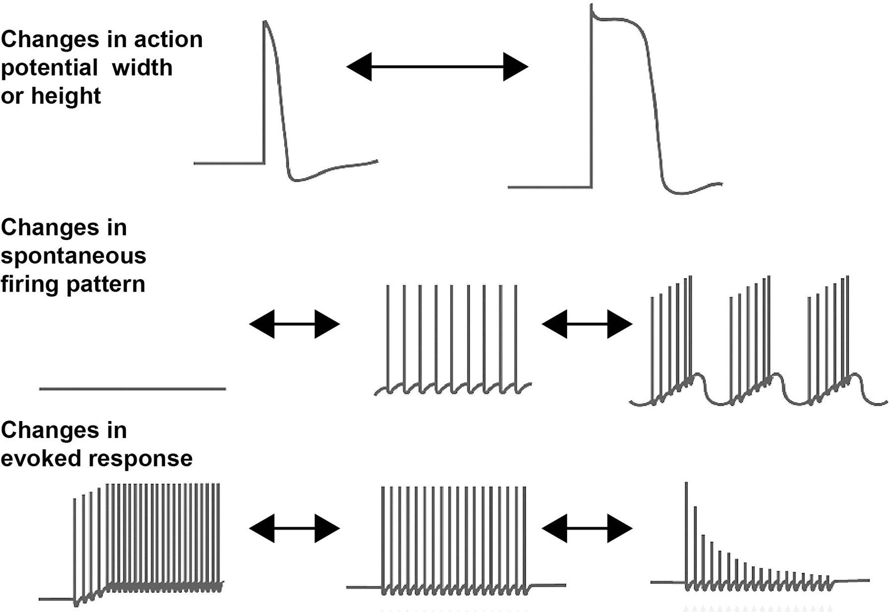 Figure 1.1 Schematic diagram illustrating different types of neuronal firing patterns and ways in which they may be altered by modulation of ion channels.