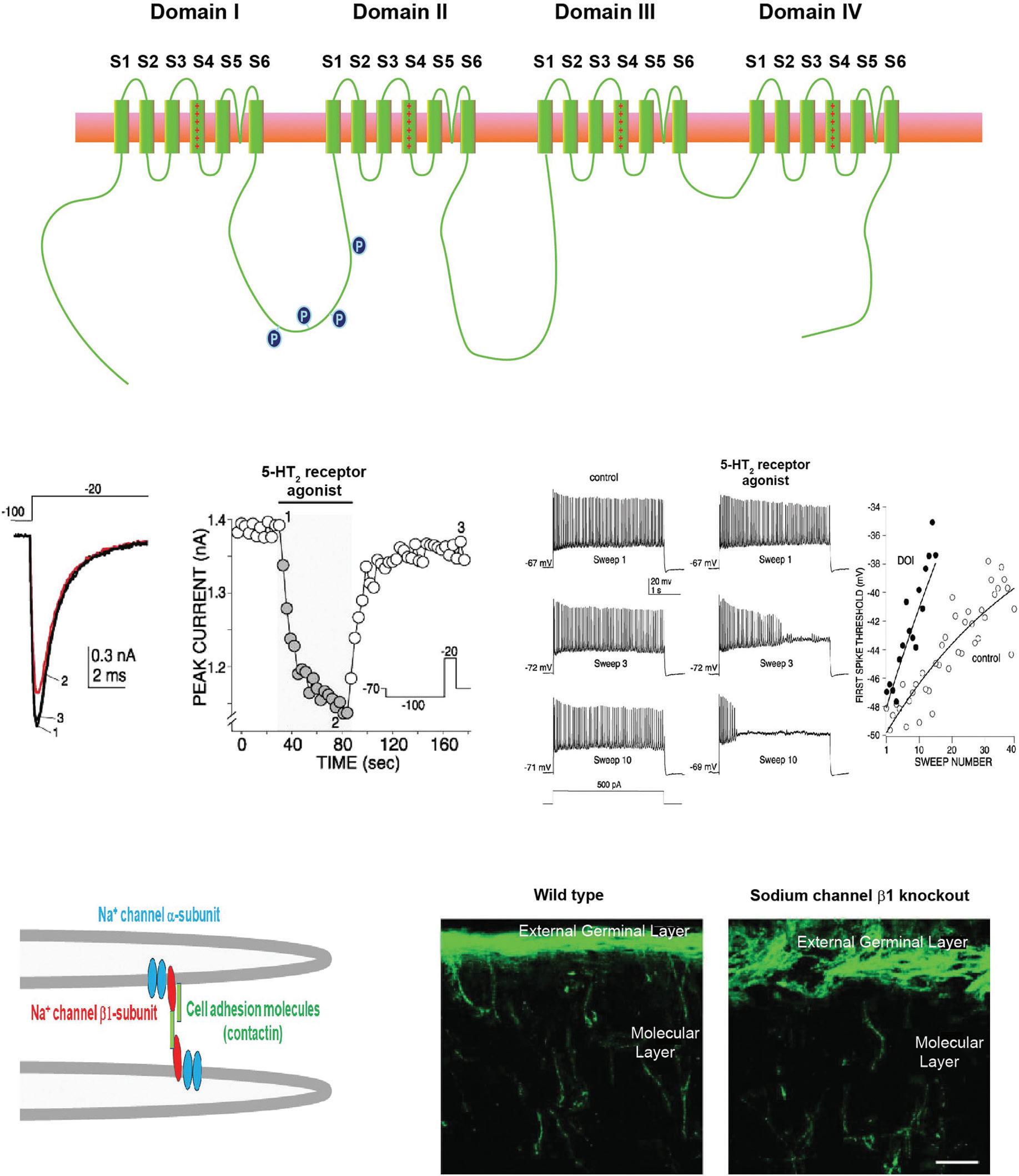 Figure 1.2 Voltage-dependent sodium channels. (A) Schematic diagram of the transmembrane topology of a sodium channel α subunit. (B–E) Stimulation of 5-hydroxytryptamine 2 (5-HT2) receptors reduces Na+ current in pyramidal cells of mouse prefrontal cortex. (B) An example of Na+ current measured by stepping the membrane potential from –100 to –20 mV before and after (red trace) application of 2,5-dimethoxy-4-iodoamphetamine (DOI), a 5-HT2 receptor agonist. (C) Time course of the decrease in current after application of DOI. (D) Examples of the effects of repeated depolarization of pyramidal cells on the firing of action potentials before and after application of DOI. (E) Plots of the membrane threshold for triggering an action potential with repeated stimulation as in (C) before and after DOI application. Data from Carr et al. (2003). (F) Sodium channels contribute to cell adhesion through their β subunits. Schematic diagram of Na+ channels on the processes of two different neurons. The associated β1 subunits can mediate cell–cell adhesion either directly by β1–β1 binding or indirectly through other associated cell adhesion molecules such as contactin (O’Malley & Isom, 2015). (G) Genetic deletion of the Na+ channel β1 subunit results in the disorganization of the axons of cerebellar granule neurons in the cerebellum. In this image, the growing axons have been labeled (green) with an antibody to a cell adhesion molecule, Transient Axonal Glycoprotein 1(TAG-1), that is restricted to these neurons (Brackenbury et al., 2008).