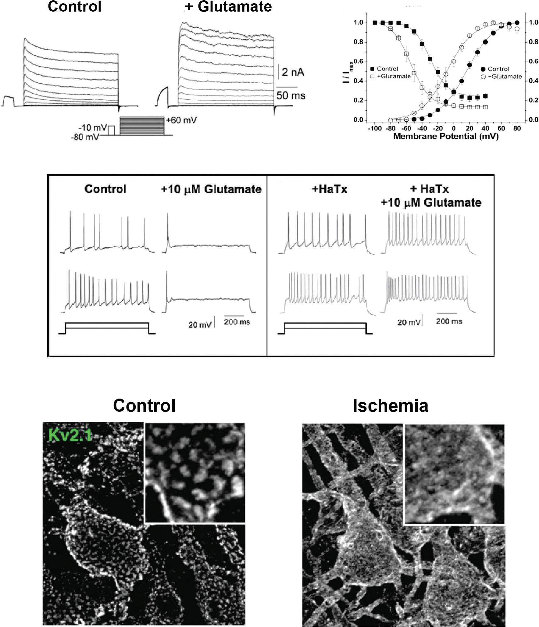 Figure 1.5 Modulation of the Kv2.1 channel. (A) Application of a low concentration of glutamate increases K+ current in cultured hippocampal neurons. (B) Glutamate alters the voltage dependence of activation and inactivation of K+ current in these neurons. (C) Left panel shows that a low concentration of glutamate suppresses the firing rate of hippocampal neurons in response to two different levels of depolarizing current. Right panel shows that the effects of glutamate on firing are abolished in the presence of hanatoxin (HaTx), an inhibitor of Kv2.1 channels. (A–C) are from Mohapatra et al. (2009). (D) Immunostaining of clusters of Kv2.1 channels on cortical neurons under control conditions and after dissolution of the clusters during acute brain ischemia (Misonou et al., 2008).