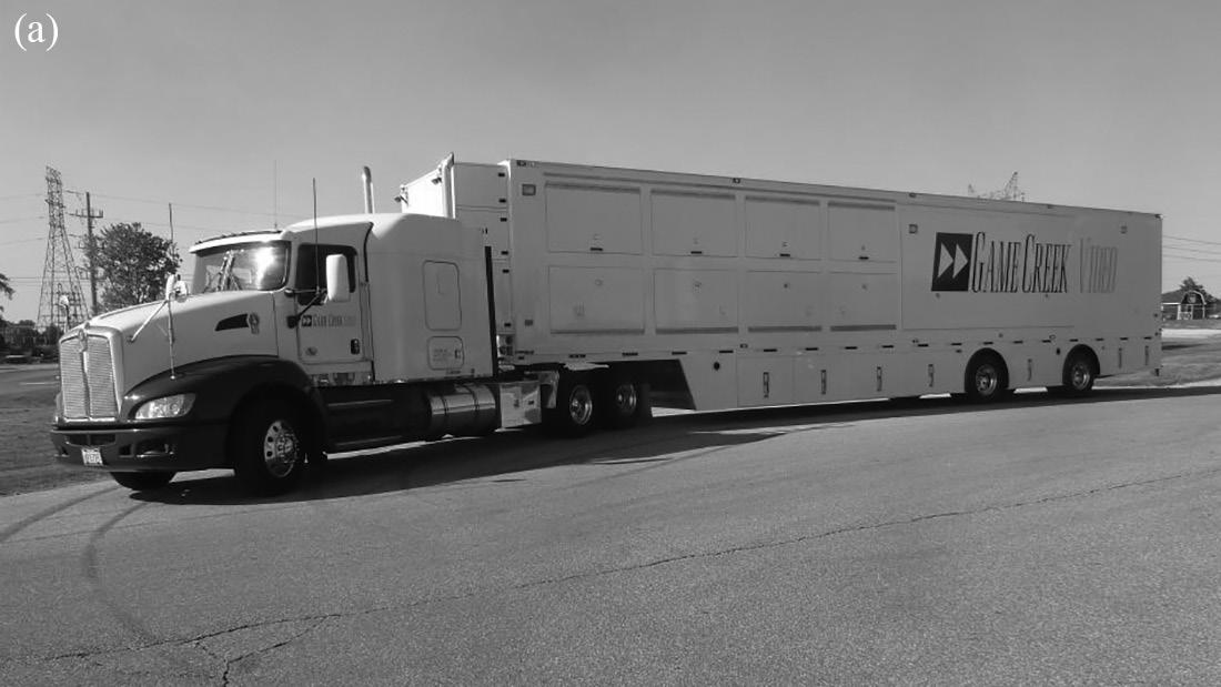 Figure 1.6 A truck used for remote production (a), and the control room inside a remote truck (b). (Photos courtesy of Game Creek Video.)