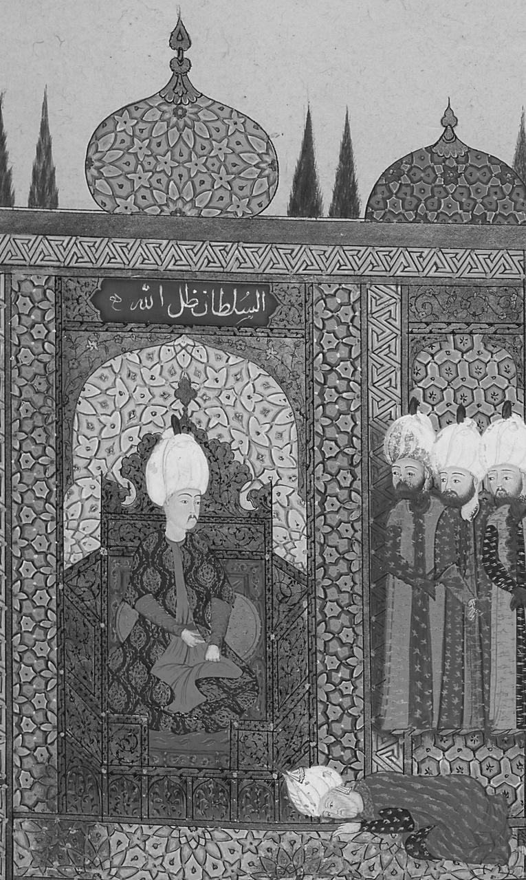 FIG. I.1 Süleyman receives a Safavid envoy. The panel above his head reads, in Arabic, “The sultan is the Shadow of God [on Earth].” Detail from Sulaymannama, 332a. Courtesy of the T.C. Cumhurbaşkanlığı Milli Saraylar İdaresi Başkanlığı.