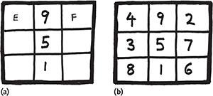 Having put 9 in a non-corner position (Fig. 17a), we now need E + F = 6, with only 2, 3, and 4 to play with, which leads to two possibilities: