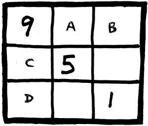 The question then arises: where is the 1going togo? Wherever we put it, we find ourselves with some row, column, or diagonal in which the most we can manage is 1 + 4 + 9 = 14, rather than 15.