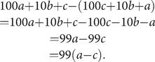 Let the starting number have digits a, b, and c, where a − c will be greater than 1. Then that number is actually 100a + 10b + c, and after reversing and subtracting we have