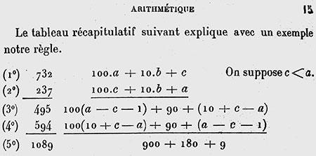 Fig. 12 The 1089 trick, in RecreationsetProblemes MathematiquesdesTempsAnciensetModernes, by J. FitzPatrick (1896). At stage 3, in order to avoid the second bracket being negative, one of the 100s has been converted into 90 + 10