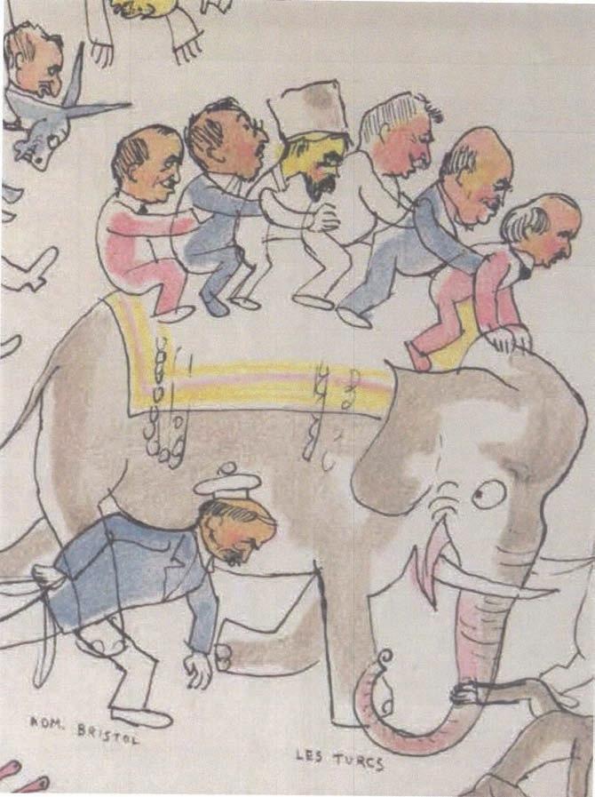 Plate 8 On ferme. Detail, the Turkish delegation leaves Lausanne. İsmet, first from right on the elephant; Riza Nur, third from right.