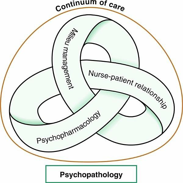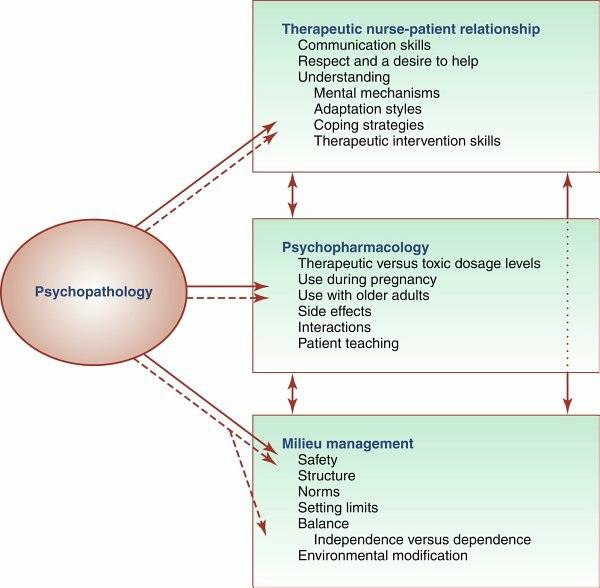 Psychiatric treatment can be divided into five basic categories: (1) use of words, (2) use of drugs, (3) use of environment, (4) use of somatic therapies, and (5) use of behavioral conditioning. Psychotherapeutic management emphasizes the first three of these categories: (1) words from which nurses develop the nurse-patient relationship, (2) drugs, specifically psychotropic drugs, and (3) environment (as noted, the French word for environment, milieu, is often used). However, the nurse cannot effectively use these interventions unless she has a sound understanding of psychopathology (Fig. 1.1).