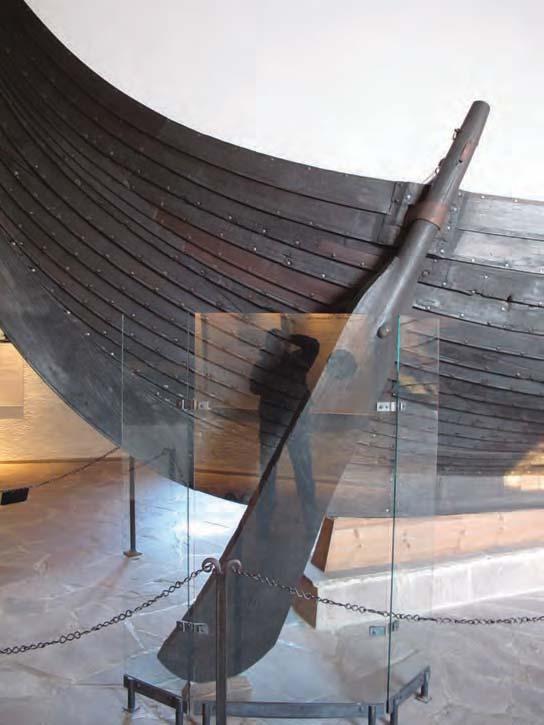 A tourist photographs the steerboard of a restored Viking longship. “Steerboard” became “starboard,” the right side of a vessel.