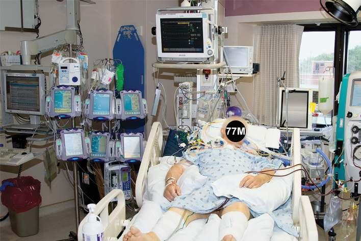 Figure 2.1. Critically ill 77-year-old man in a cardiovascular intensive care unit. The complexity of care (mechanical ventilation, dialysis, and multipharmacy) can seriously hinder the neurologic examination for consulting physicians.