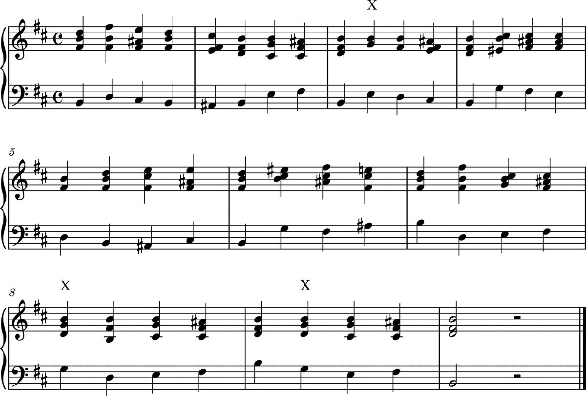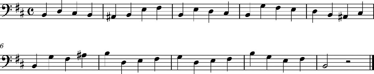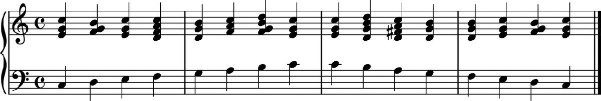 EXERCISE. Copy the bass line of Furno #1 into your zibaldone. Figure out what harmonies to use over each bass note, and play them. Write them in if you need to, but try to solve them at sight, without any help beyond the written bass line. Begin playing, taking the bass with the left hand and all upper voices with the right. Start in any position of the first chord; all three positions will work. Remember that positionrefers to what note is in the top voice, and is not to be confused with inversion. Find the 4-6 Exceptions and harmonize them appropriately. Do not let the soprano move in parallel fifths or octaves with the bass. As a general rule, if the right hand moves in contrary motion with the bass, you probably won’t get any parallels. Don’t worry about creating an interesting tune, though; at this stage all you need to do is keep the voice-leading correct. Boring is allowed. If your hands get too close together, play the bass down one octave. For now, don’t worry about playing in rhythm. Once you have found your way through, go back and try starting in the other two positions of the first chord.