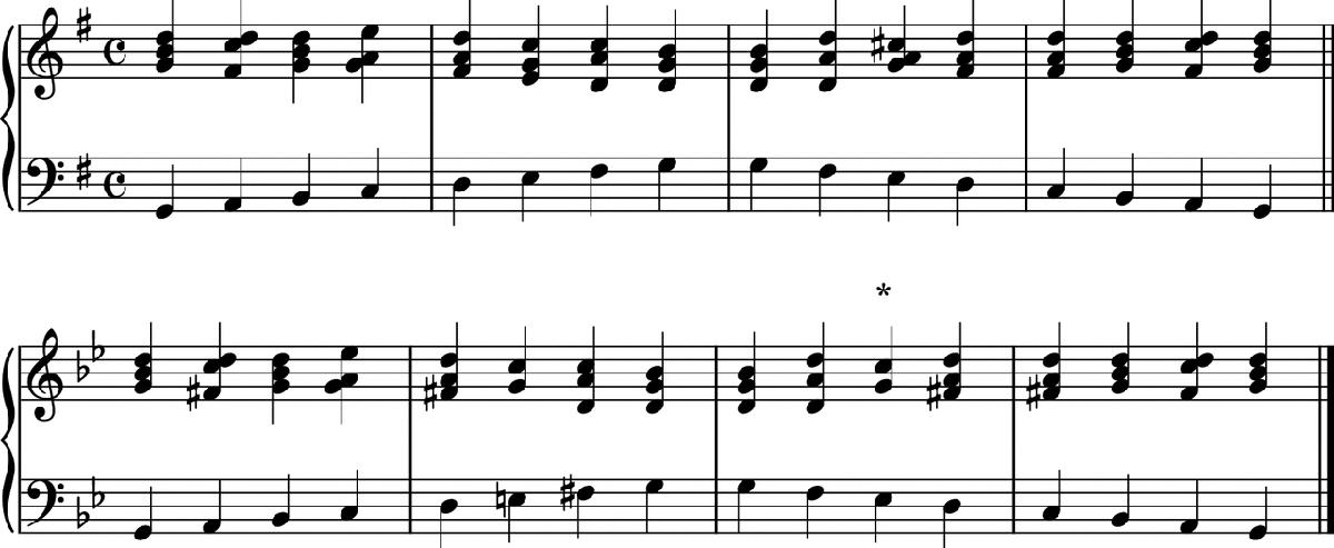 EXERCISE. After you master Simple RO, continue with Complete RO. You can begin practicing in any key, but many treatises show it in G, and follow up with partimento exercises also in G. You may try to improvise the melody or simply copy one of the previous examples in this chapter. Eventually you should learn RO in every major and minor key. For now, if you can manage all major and minor keys up to three sharps and flats, you will be ready for everything Furno will throw at you.