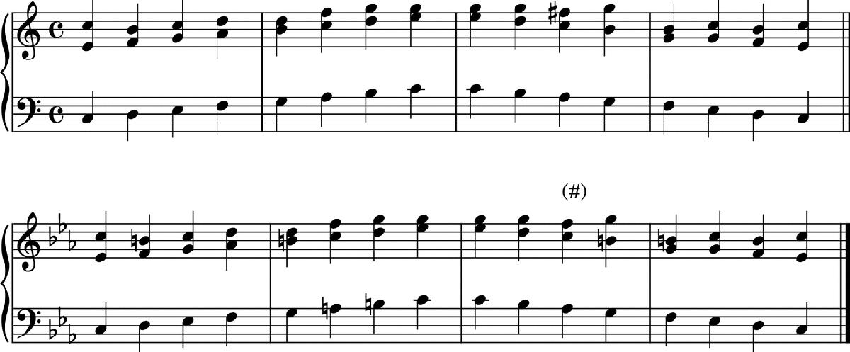 Ascending in major and minor, ① takes , ② takes , ③ takes , ④ takes , ⑤ takes , ⑥ takes , and ⑦ takes . Descending in major and minor, ① takes , ⑦ takes , ⑥ takes , ⑤ takes , ④ takes , ③ takes , and ② takes . Alternatively (and as shown in Example 1.2), ⑥ descending may take without the ♯6. (This equivocal phenomenon will be explained presently.) Note that ①, ②, ③, and ⑤ are always the same, no matter what. ④ and ⑥ take different intervals depending on whether they ascend or descend.