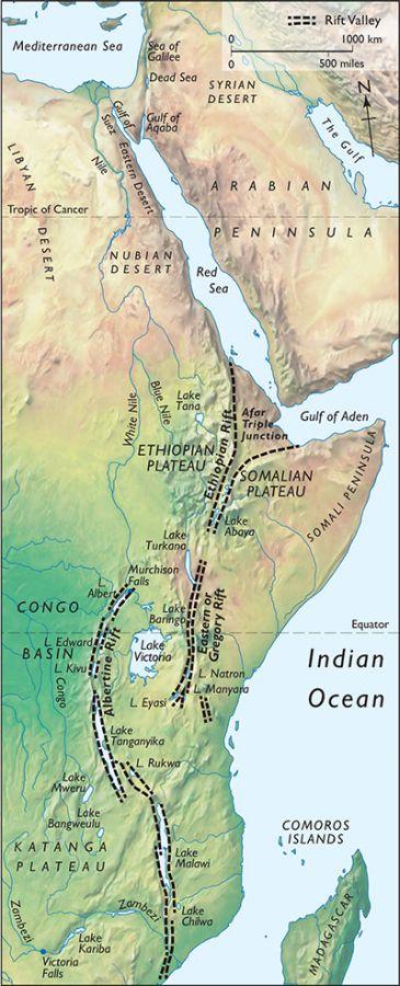 In more recent geological times fragmentation has continued, with the Arabian plate pulling away, creating the Red Sea and the Gulf of Aden. Meanwhile, East Africa was experiencing new tensions as the upwelling of the viscous mantle of the earth’s core began to push up the surface crust, creating two great areas of highland, the Ethiopian Dome and the Kenyan Dome. The stress was such that the crust eventually split, forming rift valleys, deep fissures flanked by cliff-like escarpments up to 1,000 metres high. There are three major fracture lines, the Albertine Rift, or Western branch, the Gregory Rift, or Eastern branch, and the Ethiopian Rift. The Albertine Rift is now partially occupied by a succession of sinuous lakes, Malawi, Tanganyika, Kiva, Edward, and Albert, while the Gregory Rift is home to Lake Turkana. The Ethiopian Rift tore through the Ethiopian Highlands to join with the wider parting of the plates, filled now by the Red Sea and the Gulf of Aden. The African rifts represent a fracture zone created as the eastern strip of Africa, known as the Somalian plate, pulls away from the rest of the continent, the African (or Nubian) plate.